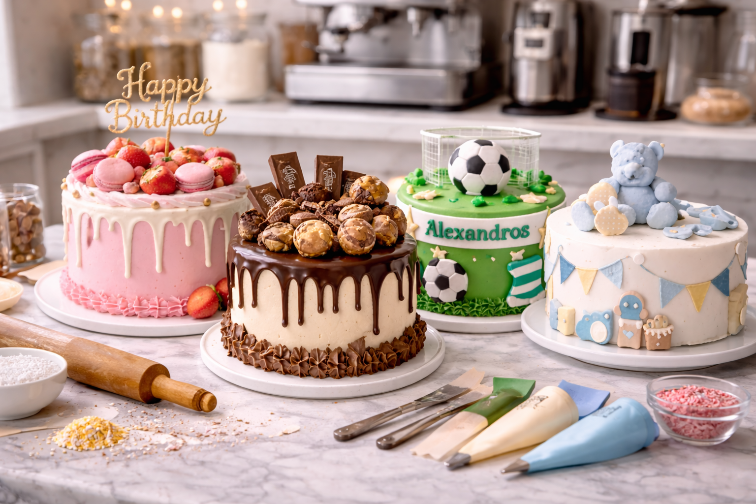 Αναλαμβάνουμε τούρτες κατόπιν παραγγελίας, προσαρμοσμένες στις ανάγκες και τις προτιμήσεις σας. Μπορούμε να διαμορφώσουμε γεύσεις, διακόσμηση και μέγεθος σύμφωνα με αυτό που επιθυμείτε, πάντα με έμφαση στη σωστή ισορροπία γεύσεων και στην προσεγμένη παρουσίαση.
